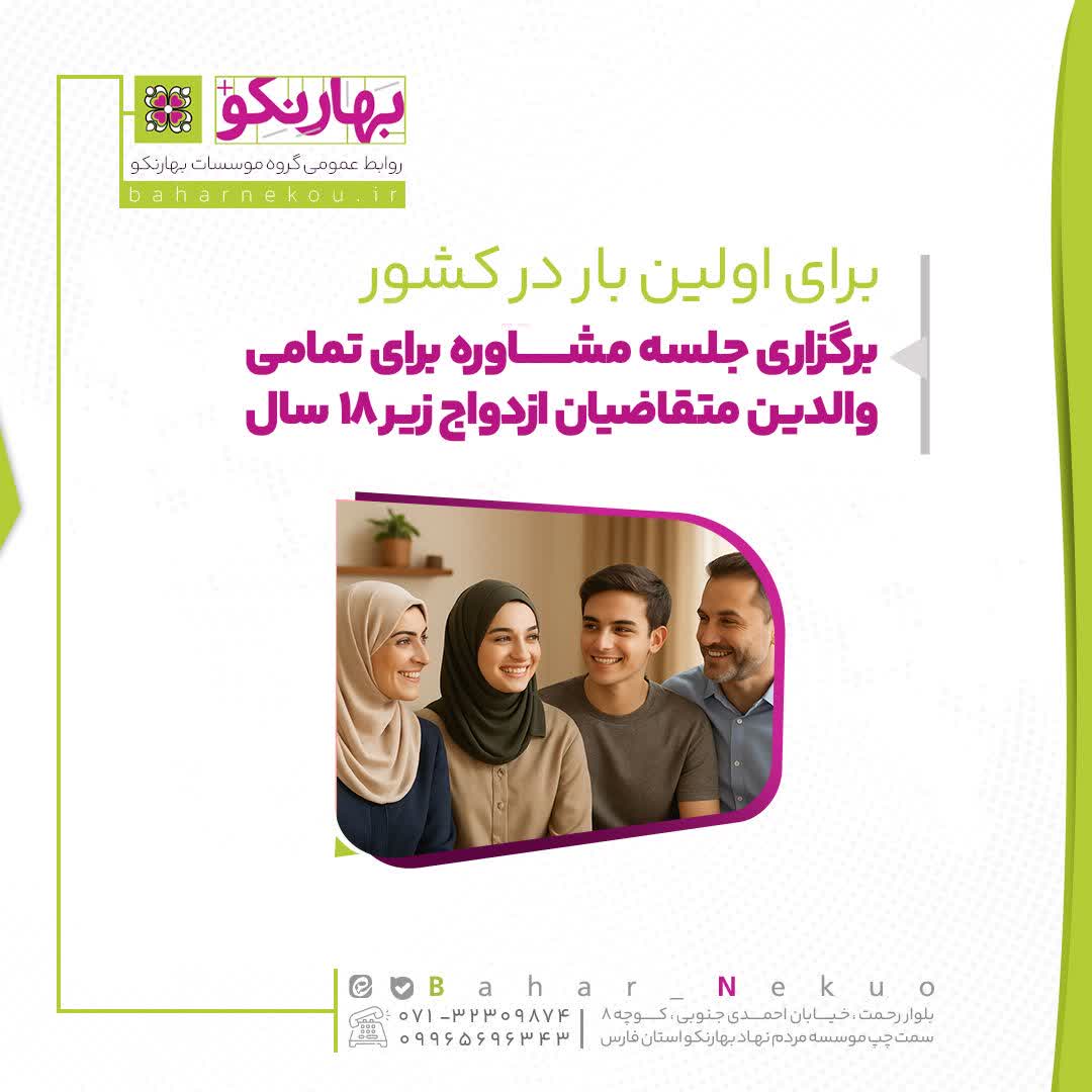 به گزارش روابط عمومی گروهموسسات خانواده بهارنکو دکتر حمید مقامی، مدیرعامل گروه موسسات خانواده بهارنکو، از برگزاری مشاوره، برای والدین عروس و دامادی که به ترتیب زیر ۱۸ و ۲۰ سال سن دارند، خبر داد که این اقدام برای نخستین بار در سطح کشور اجرا میشود.